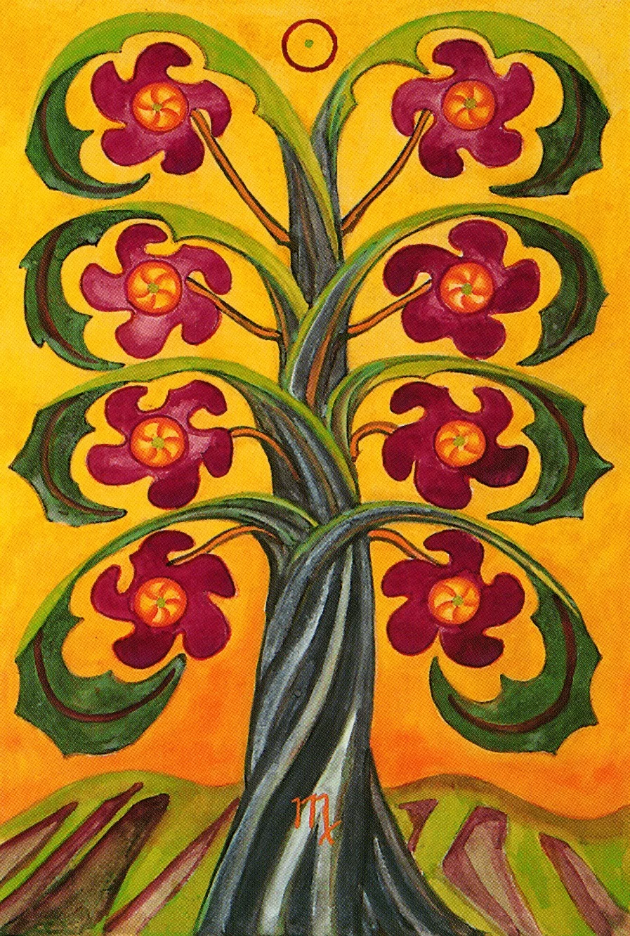 This harmonious ordering of life produces works of proportion and symmetry, and promotes health and balance. With the right amount of sun, rain, breeze, and soil, a tree can take root, grow strong, and bear fruit. It is a process which is largely invisible but essential for life, and we can see it clearly on the Thoth version of the 8 of Disks.