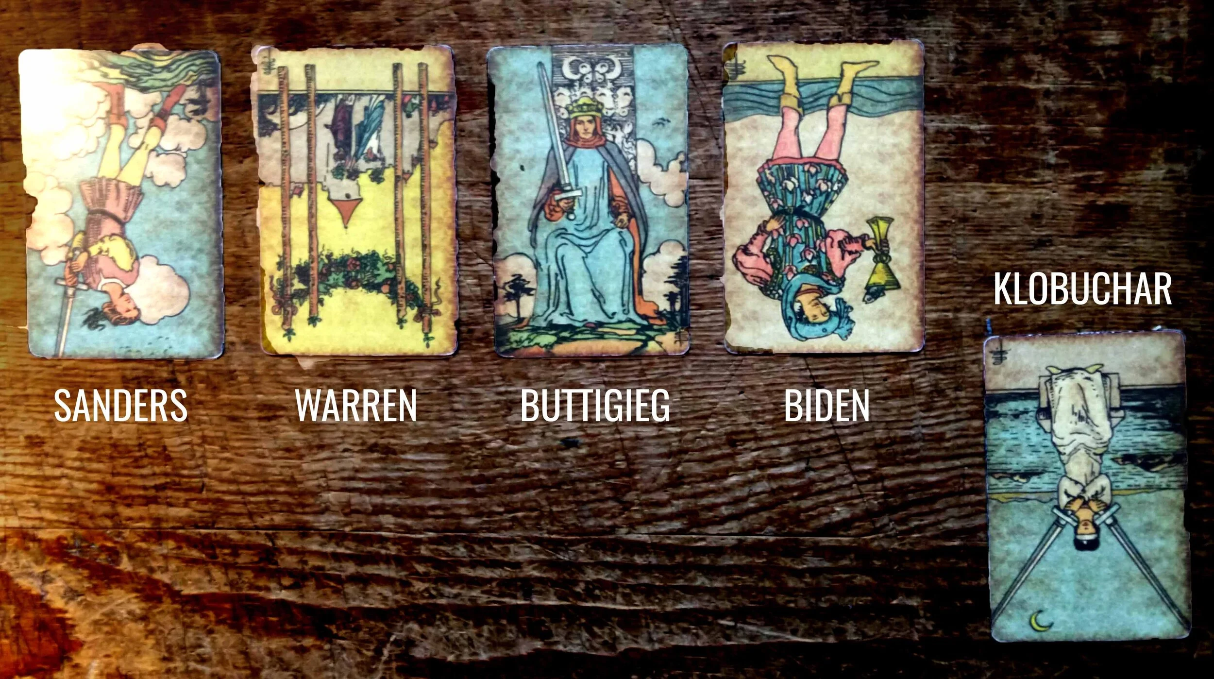 BLOOMBERG. 5 of Swords. Who says money can’t buy love? Here’s somebody who is working every unfair advantage he has. Personally I feel he’s going to come in last, but again, the cards disagree. The 5 of Swords is a Pyrrhic victory, a win with hard feelings. The draw suggests Bloomberg will make a big splash (probably in the rural states), but that it also causes folks to think about why they can’t stand him.